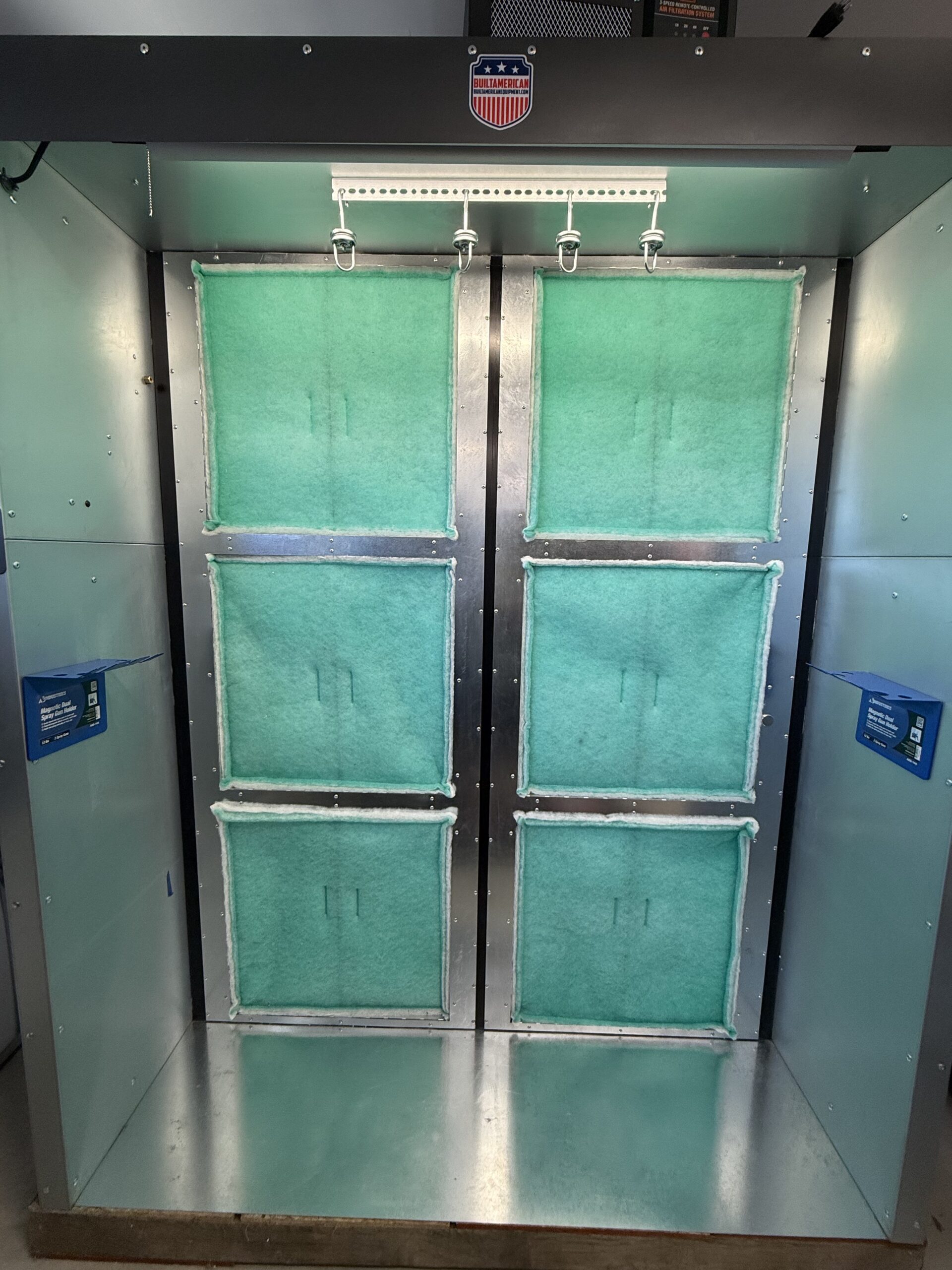 - Built American Equipment double-width spray booth with LED lighting and recirculation system